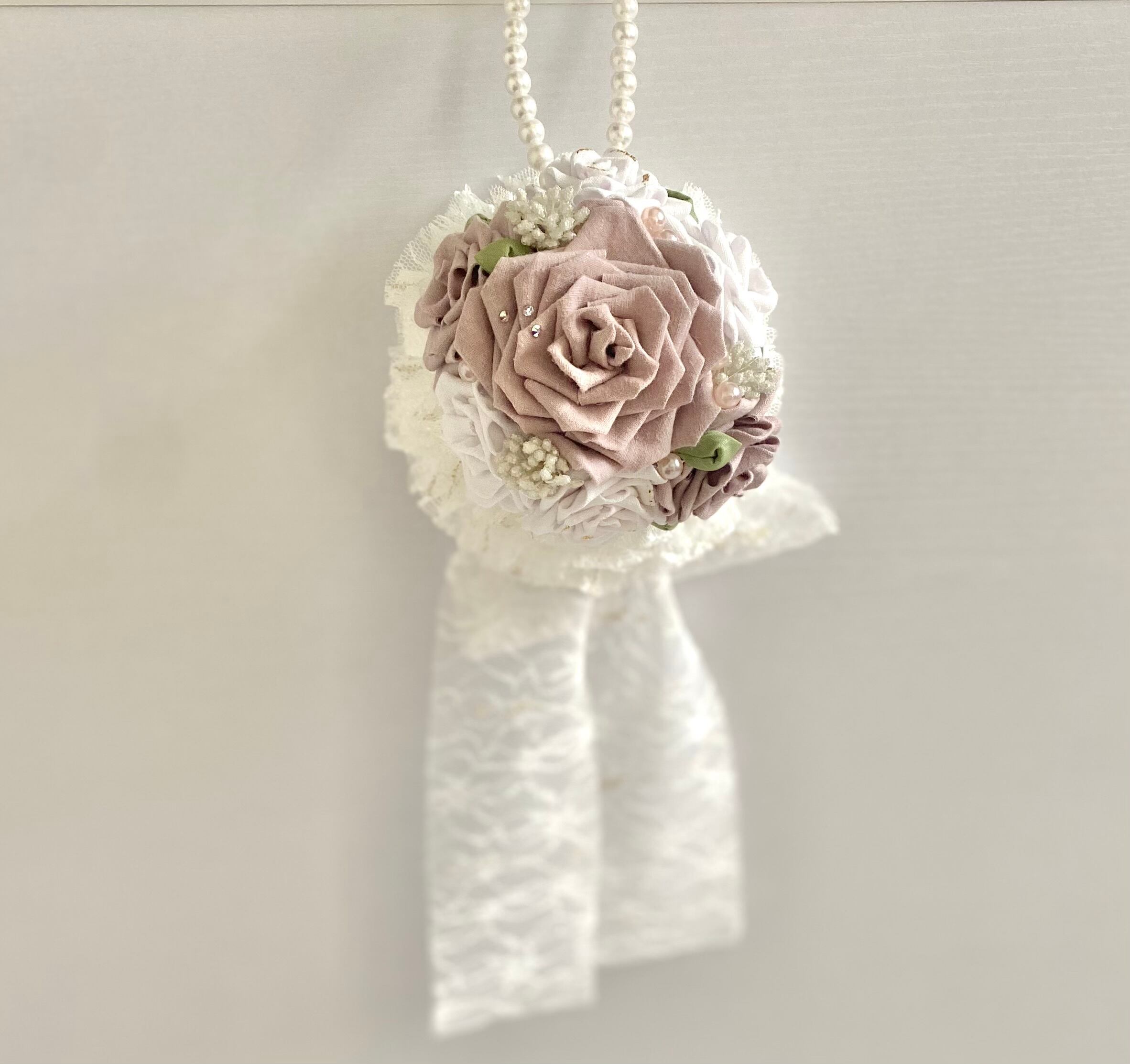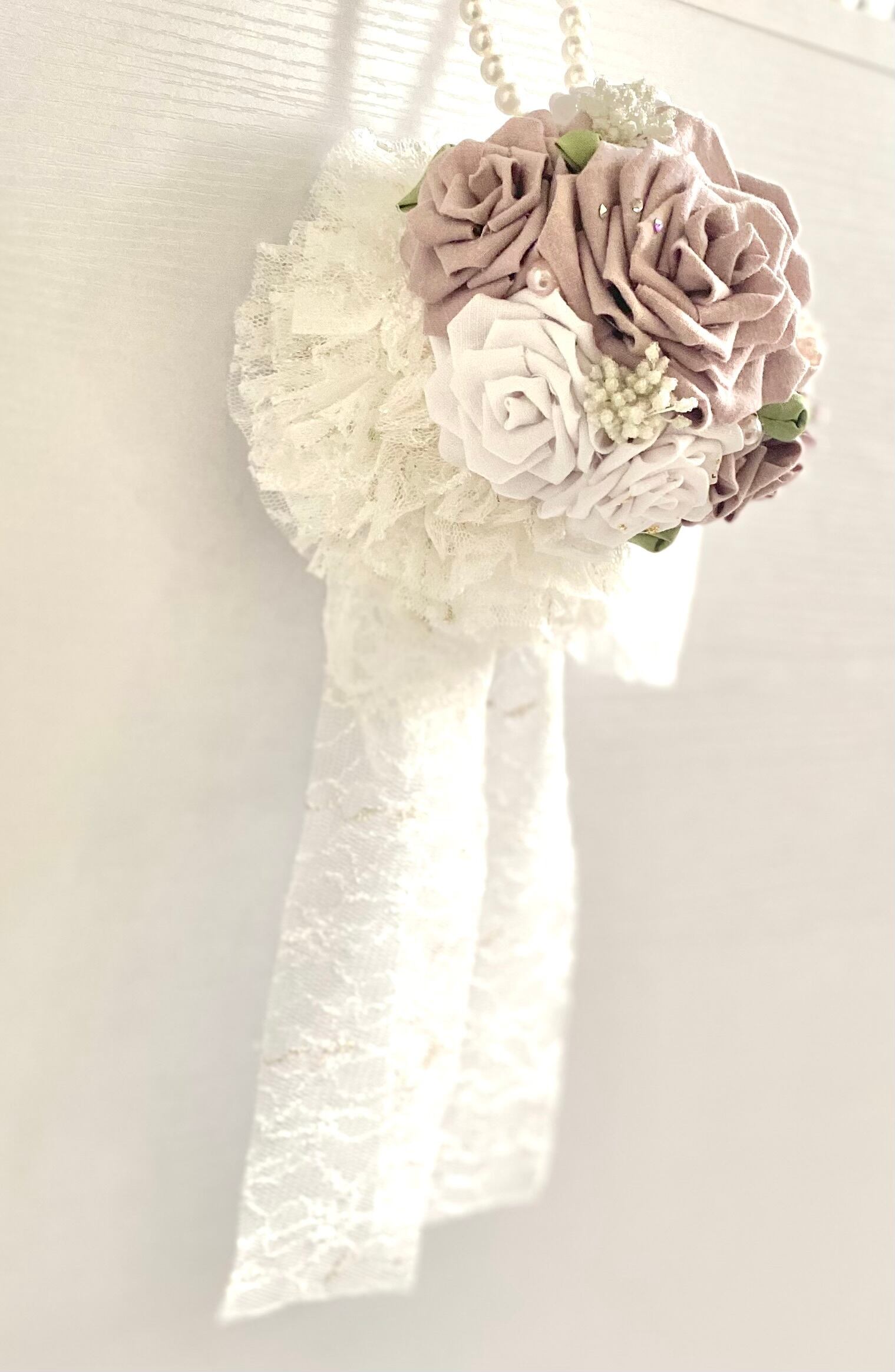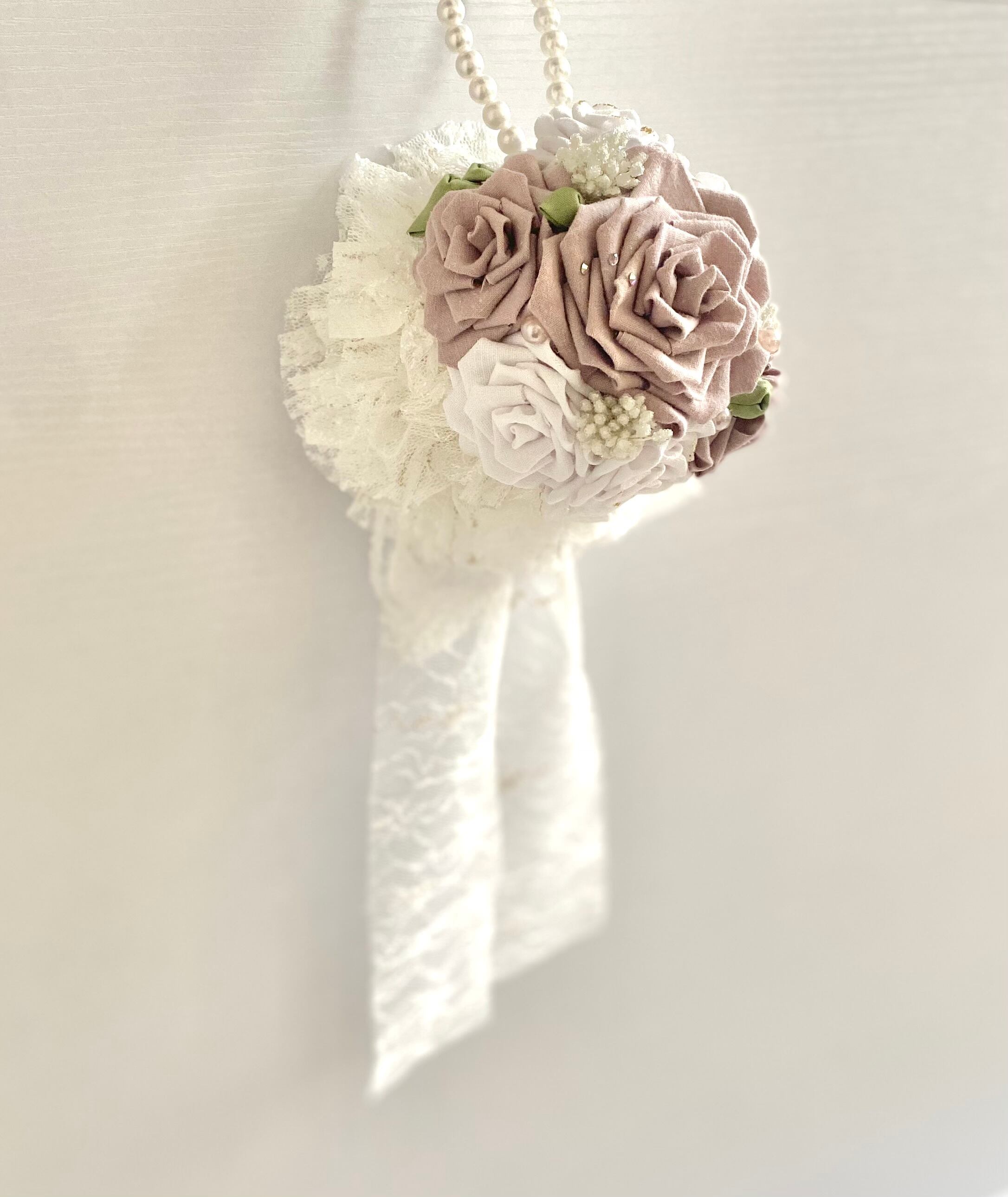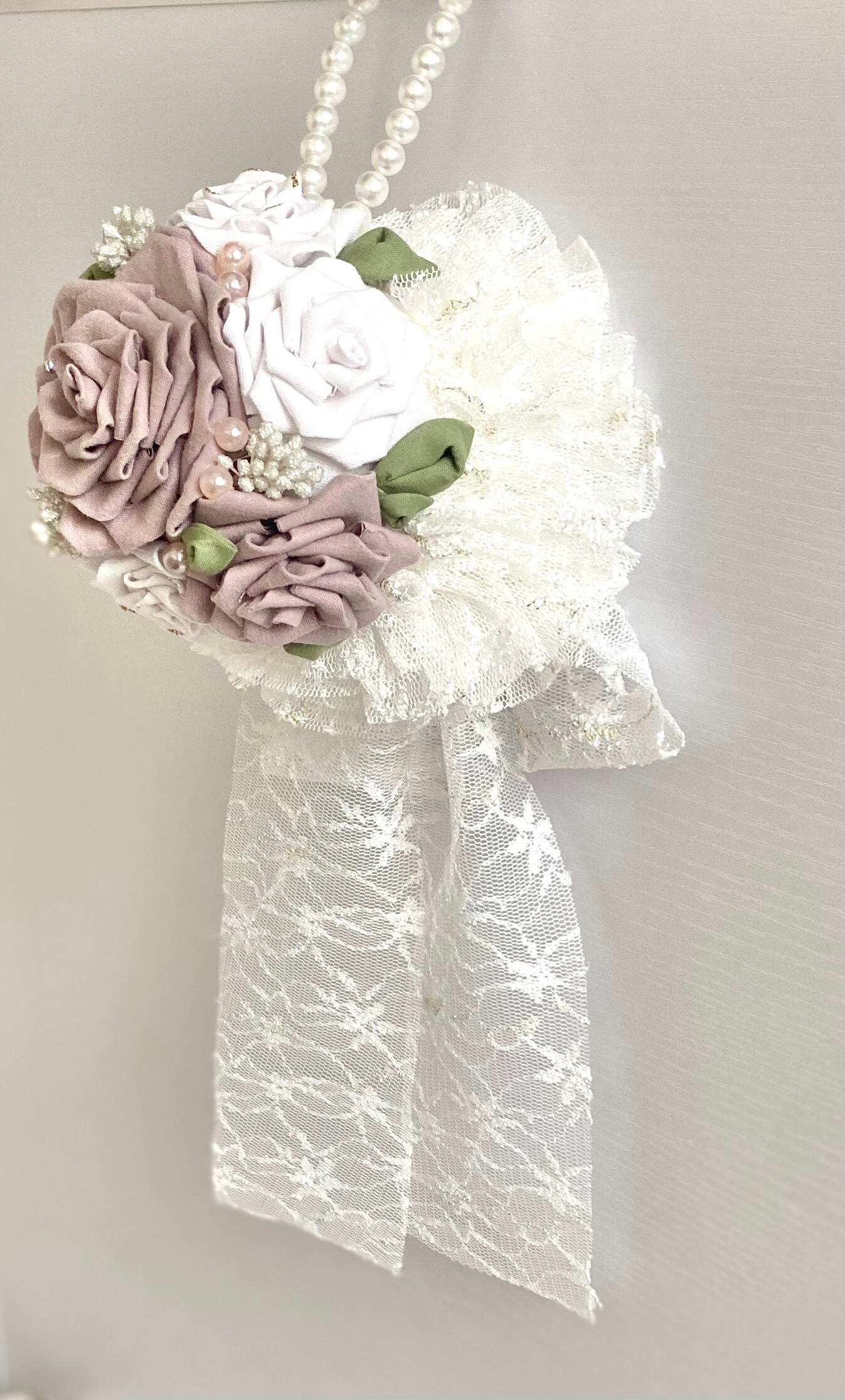 メインの薔薇は約7.5cm大ぶりの薔薇にはスワロフスキーをつけています。